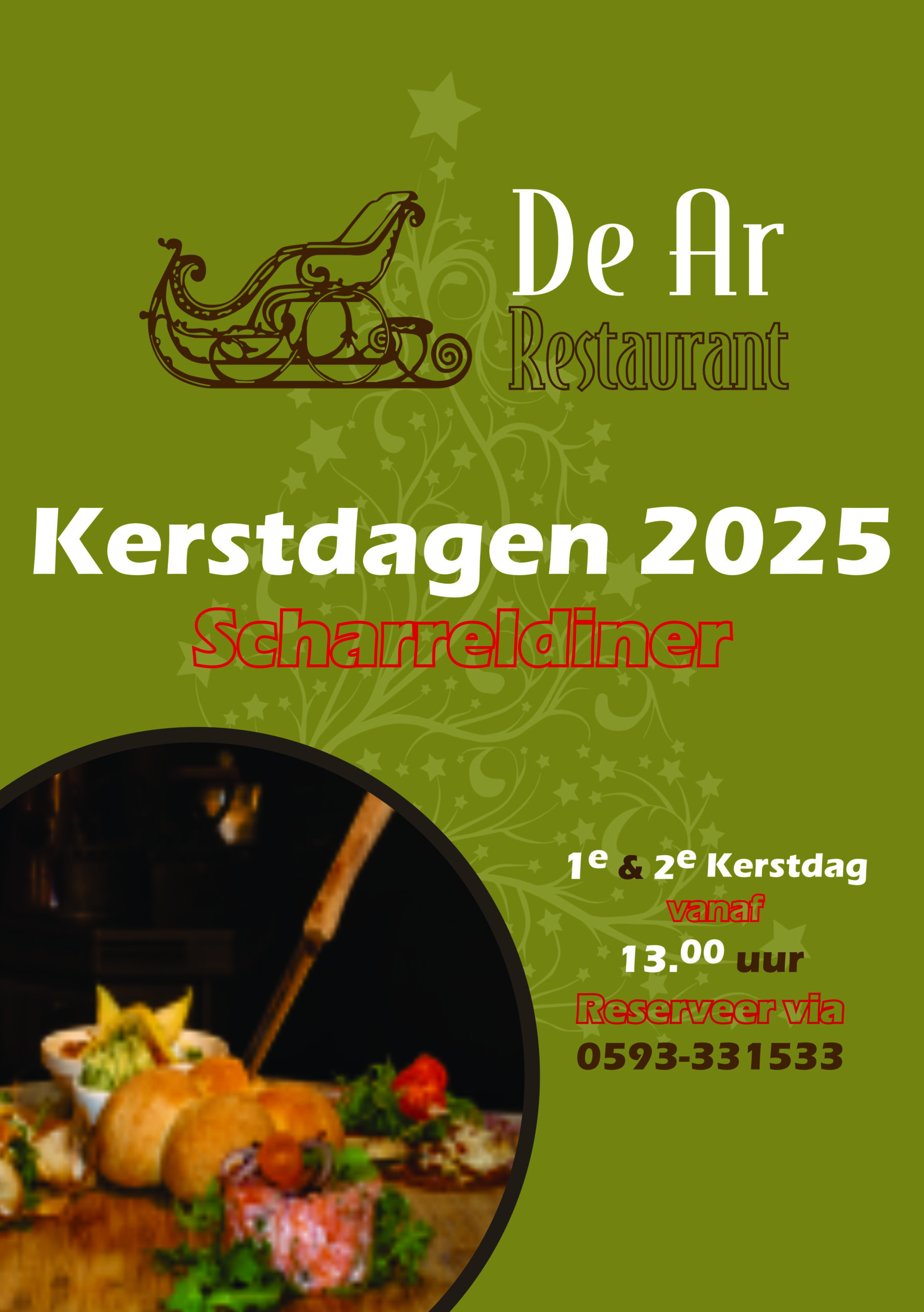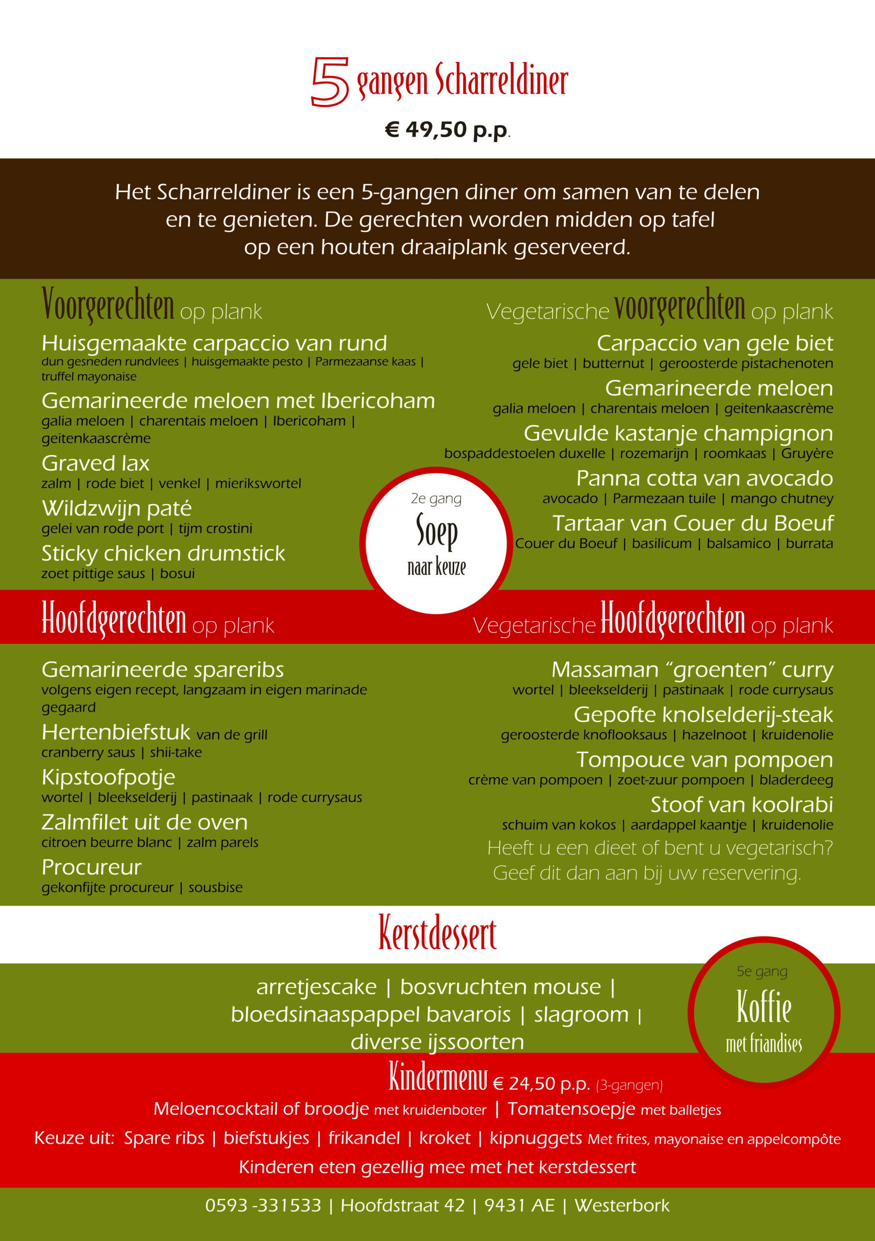 Met kerst gaan we weer Scharrelen! Het Scharreldiner is een 5-gangen diner om samen van te genieten. De gerechten worden per gang geserveerd op een houten draaiplank, midden op tafel. Zo kunt u als gast van alle gerechten iets proberen.